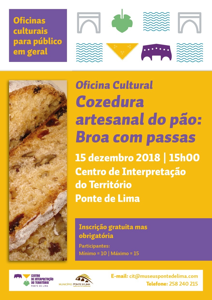 O Centro de Interpretação do Território (CIT) de Ponte de Lima promove no próximo dia 15 de dezembro, pelas 15h00, uma Oficina Cultural de Cozedura Artesanal do Pão, dedicada à confeção da tradicional broa com passas cozida em forno antigo de lenha. A iniciativa destina-se ao público em geral que poderá participar gratuitamente, bastando para isso o preenchimento do formulário de inscrição disponibilizado para o efeito.