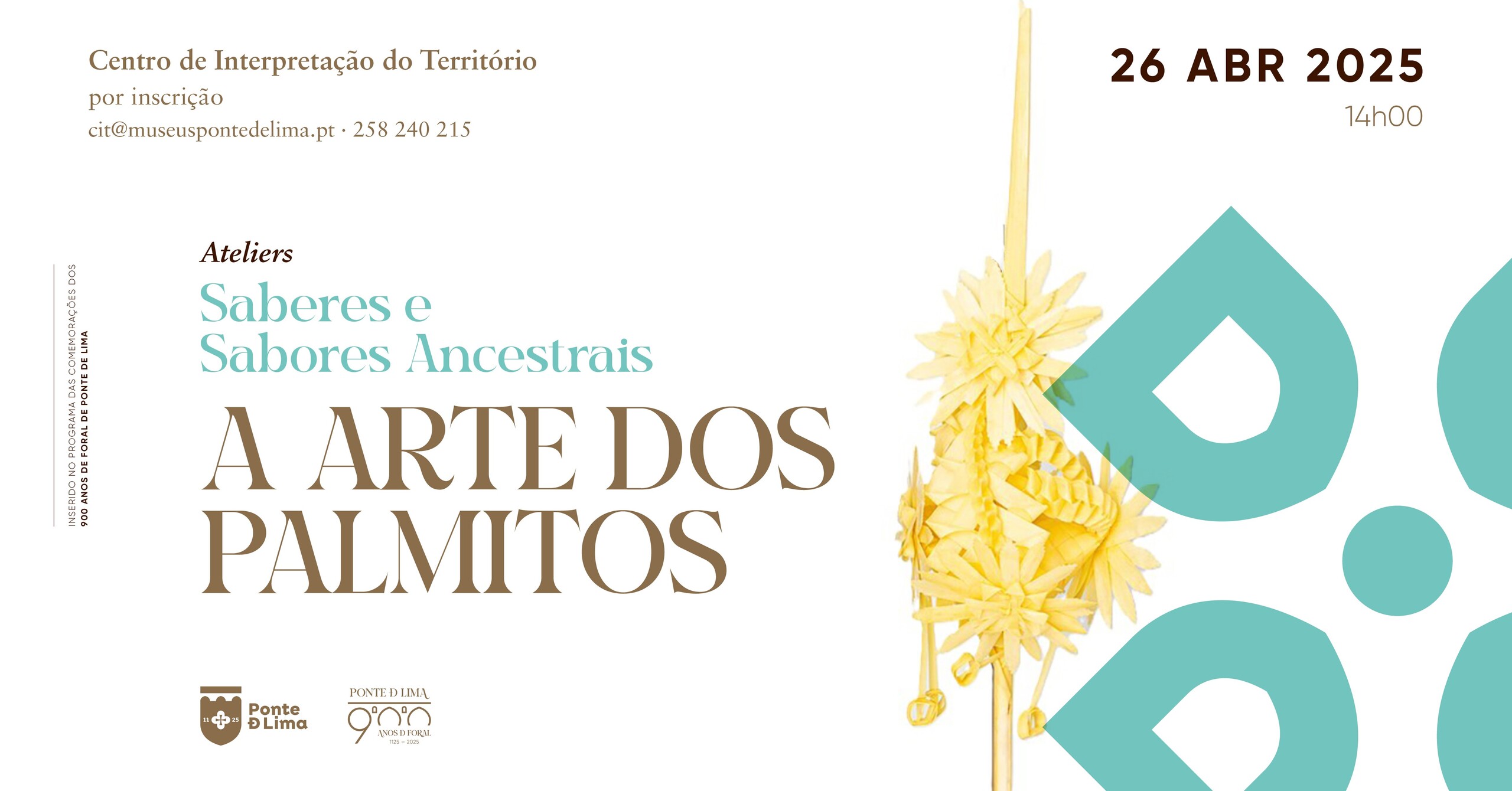 No âmbito das comemorações dos 900 anos do Foral Teresiano, o Centro de Interpretação do Território (CIT) – espaço de promoção etnográfica do Município de Ponte de Lima – vai dinamizar, no próximo dia 26 de abril, pelas 14h00, uma oficina dedicada aos palmitos de palma, importante tradição associada às festividades cíclicas, mormente ao ciclo pascal, assumindo particular destaque no Domingo de Ramos com a sua bênção.