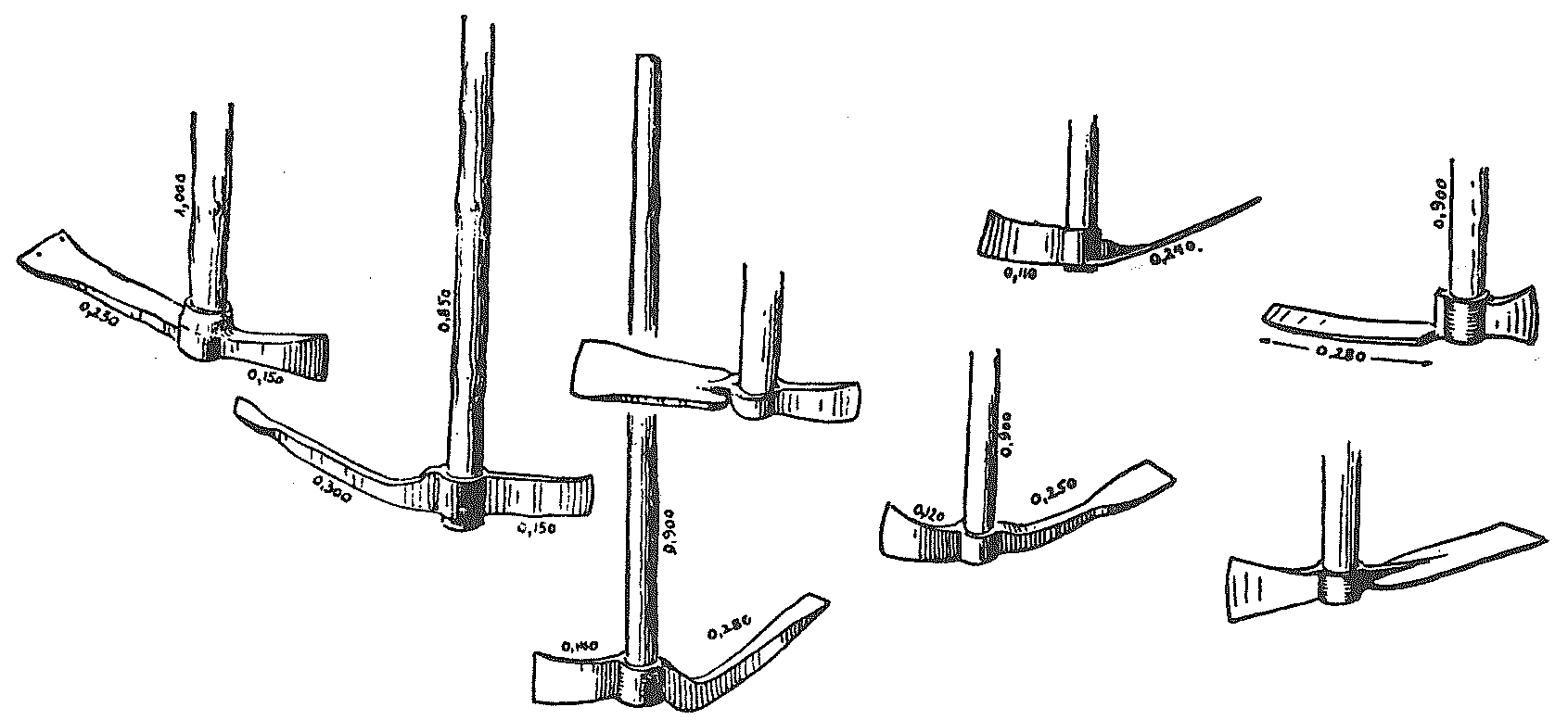 Esta espécie de alfaia apresenta, no território nacional, uma grande variedade de formas, sendo provavelmente mais comum aquela que é conhecida em quase todo o país pelo nome de alvião. Este utensílio é constituído por uma lâmina longa e espessa, podendo ser direita ou encurvada, espalmada a todo o comprimento ou apenas na ponta, com unha ao jeito de um machado. É utilizado sobretudo para abrir covas ou valas em terrenos pedregosos ou cheios de raízes, para arrancar cepas, entre outros trabalhos agrícolas, desmontando a terra com o bico laminado e cortando as raízes com a unha (tipo machado).