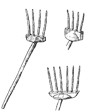 A forquilha de pau é composta por uma peça de madeira na qual são cravados os dentes – em regra, 4 ou 6 – alinhados, paralelos ou em leque, e por cabo de secção circular, formando com os dentes um ângulo sensível.