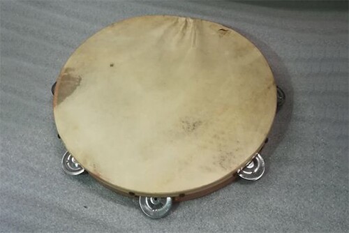 A pele (ou membrana vibrante) é normalmente pregada ao rebordo do aro de madeira no qual se encontram os discos metálicos ou soalhas.