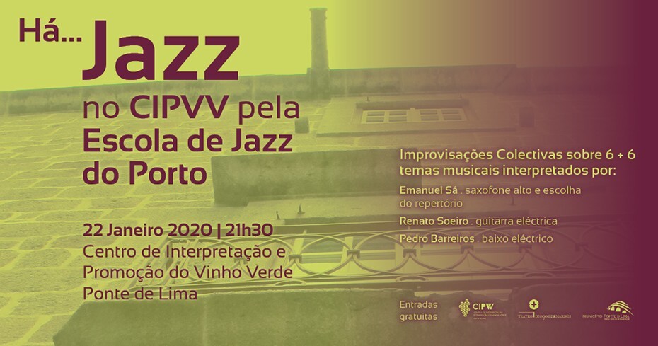 A 22 de janeiro, às 21h30, no CIPVV - Centro de Interpretação e Promoção do Vinho Verde, com entradas gratuitas, Há... Jazz no CIPVV, pela Escola de Jazz do Porto, com Improvisações Colectivas sobre 6 + 6 temas musicais interpretados por: