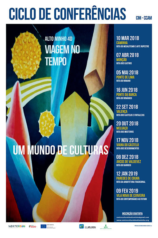 O projeto “Alto Minho 4D – Viagem no Tempo” vai dinamizar uma atividade por mês em cada concelho do Alto Minho Depois de uma primeira passagem por Caminha, no passado dia 10 de março, com a conferência técnico-científica sobre a "Rota do Megalitismo e da Arte Rupestre", e Monção, no dia 7 de abril, com a “Rota dos Castros”, segue-se Ponte de Lima, no dia 5 de maio, com a “Rota do Romano”; Ponte da Barca, no dia 16 de junho, com a “Rota do Românico”; Valença, no dia 22 de setembro, com a “Rota dos Castelos e Fortalezas”; Melgaço, no dia 20 de outubro, com a “Rota dos Mosteiros”; Viana do Castelo, no dia 17 de novembro, com a “Rota dos Descobrimentos”; Arcos de Valdevez, no dia 8 de dezembro, com a “Rota do Barroco”; Paredes de Coura, no dia 12 de janeiro de 2019, com a “Rota da Arquitetura Tradicional”; e termina em Vila Nova de Cerveira, no dia 9 de fevereiro 2019, com a “Rota do Contemporâneo ao Futuro”.