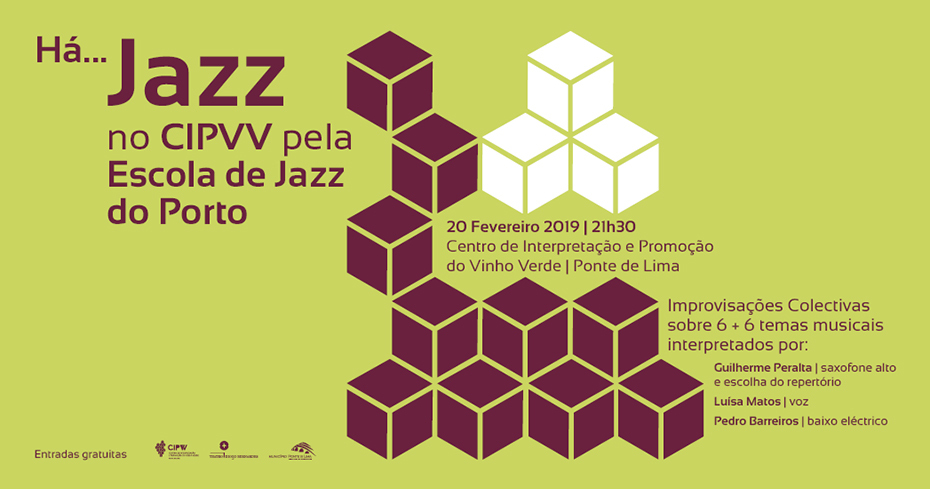 A 20 de fevereiro, às 21h30, no CIPVV - Centro de Interpretação e Promoção do Vinho Verde, com entradas gratuitas, Há... Jazz no CIPVV, pela Escola de Jazz do Porto, com Improvisações colectivas sobre 6 + 6 temas musicais interpretados por: