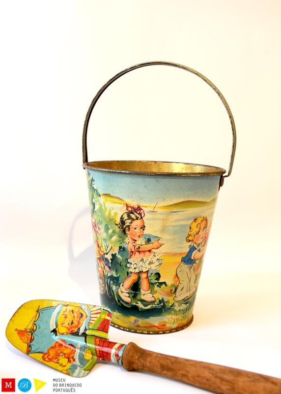 Balde e a pá de praia em folha de flandres litografada. O cabo da pá é de madeira. O balde, com uma imagem de crianças e água, tem a marca do fabricante: ANCASIL.