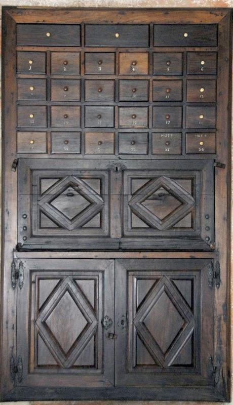 Armário embutido, em pau-santo, disposto no sentido vertical, formando três corpos distintos. O registo inferior apresenta duas portas volantes almofadadas, com losangos inscritos em retângulos. O registo intermédio é composto por um batente almofadado, que, quando aberto, serve como superfície horizontal de apoio à escrita, funcionando como escrivaninha. O nível superior é constituído por uma secção de vinte e quatro gavetas, numeradas, dispostas em seis colunas, sobrepujadas por outras três gavetas, não numeradas, de maior dimensão. As gavetas incorporam puxadores em marfim e em madeira com forma de maçanetas.