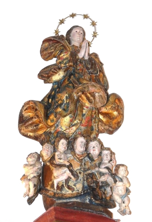 Imagem fiel à conceção barroca, consegue combinar a marca contemplativa, reveladora, através da face, de uma paz interior imperturbável, com a forte agitação traduzida nos fartos panejamentos de carácter revolto. A Virgem surge em posição frontal, em atitude orante, manifesta no alinhamento das mãos. Assenta sobre o globo, contornado pela serpe maligna, de cabeça virada para cima. Uma legião de figuras angélicas, composta por anjos de vulto que se juntam às habituais cabeças de serafins, aparece adossada à esfera terrestre, um deles pisando a cabeça da serpente com o pé esquerdo.