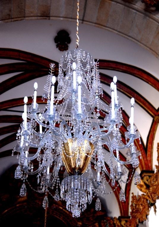 O lustre aqui apresentado, peça de aparato que enriquece o presbitério da igreja da Ordem Terceira de São Francisco, está centrado numa bacia de vidro dourado, do interior da qual arrancam vinte e quatro braços distribuídos em dois níveis, em curva e contra-curva os do registo inferior, apenas em curva os do registo superior. À volta dos braços pendem elos de pingentes compondo formas de sinos e de diamantes emoldurados.