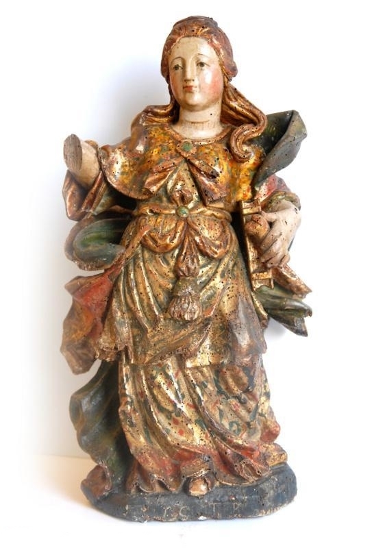 Filha de pais romanos mas consagrada a Cristo, Santa Quitéria integrava o grupo das nove irmãs gémeas virgens mártires, tal como Santa Eufémia (também representada nas coleções do Museu). A sua lenda surge recolhida em diversos Flos Sanctorum, livros biográficos que relatavam os episódios mais significativos das histórias dos santos. Na Península aparecem várias versões que localizam a história ora em Portugal ora na Galiza, consoante os interesses dos redatores e das autoridades diocesanas e monásticas. Esta Virgem, natural de Braga, foi mandada decapitar por seu pai, representante local do poder imperial de Roma. No lugar da decapitação brotou uma fonte. Acompanhada por um anjo, recolheu a sua própria cabeça e dirigiu-se a uma igreja, à cripta, onde um sarcófago estava preparado para a acolher. Aí acabou de morrer.