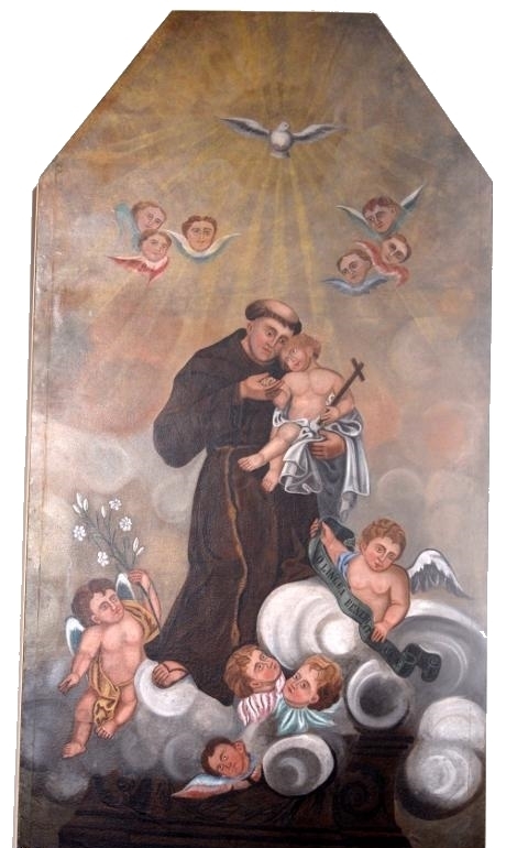 Este painel representando Santo António integrou até recentemente (altura em que foi removido para restauro) o retábulo neoclássico da capela-mor da igreja conventual de Santo António, estrutura em talha que, atendendo à gramática decorativa que exibe, foi levantada no século XIX, ainda os frades capuchos habitavam o Convento, para substituir o retábulo seiscentista que o precedeu. Na ausência de documentação, não podemos adiantar se a respectiva tela foi encomendada inicialmente com o retábulo ou se foi incorporada num período posterior. A única certeza é que se encontrava já aí em 1909, pois surge mencionado "um panno de bocca com a imagem de Santo António" no inventário realizado nesse ano pela Irmandade de Santo António dos Frades.