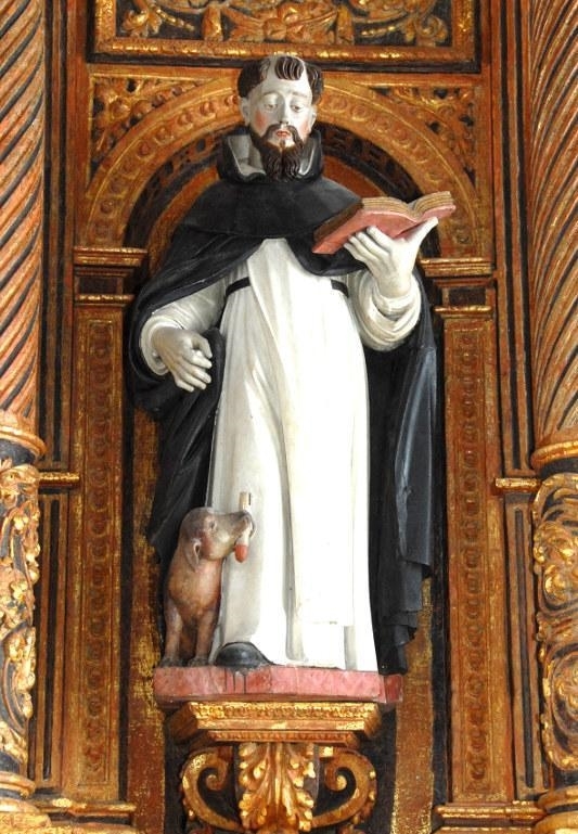São Domingos, fundador da Ordem dos dominicanos, nasceu em 1170 em Calahorra, na zona de Burgos. Passou a maior parte da vida entre França e Itália, pregando a verdade da fé. Em 1216 obteve do Papa Honório III a autorização para fundar a Ordem dos Pregadores. Morreu em Bolonha, no ano de 1221, para onde se dirigira com o propósito de presidir ao Capítulo Geral da Ordem. Canonizado em 1234. A sua lenda é compósita e vai buscar episódios às vidas de São Francisco e de São Bernardo. A aparição da Virgem do Rosário ao Santo parece ter sido forjada mais tardiamente pelo dominicano bretão Alain de la Roche, nos fins do século XV, momento em que esta devoção mariana se desenvolve.
